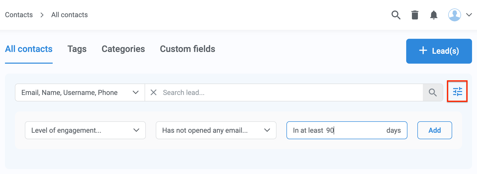 Use engagement filters to find Kartra leads that have not opened an email from you in a long time. If certain people have stopped opening your emails or clicking the links inside, there’s a good chance they’re no longer interested.