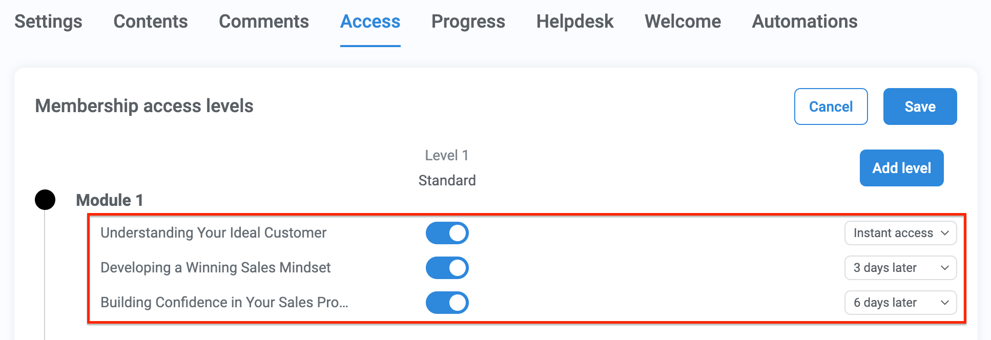 - Dynamic schedule: Content unlocks a set number of days after signup (e.g., 7 days after joining).