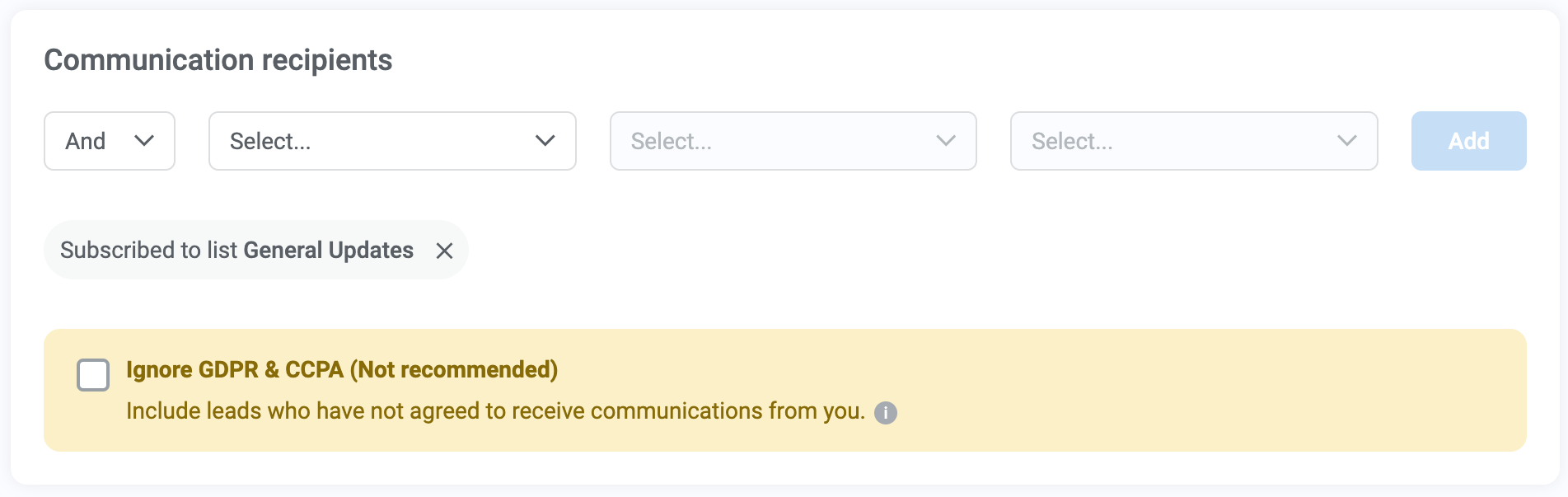 Important: The "Ignore GDPR & CCPA" option allows you to send emails to contacts who opted out of receiving marketing messages when they joined your list. Use this option carefully, and only for messages that meet exceptions under relevant data privacy regulations.