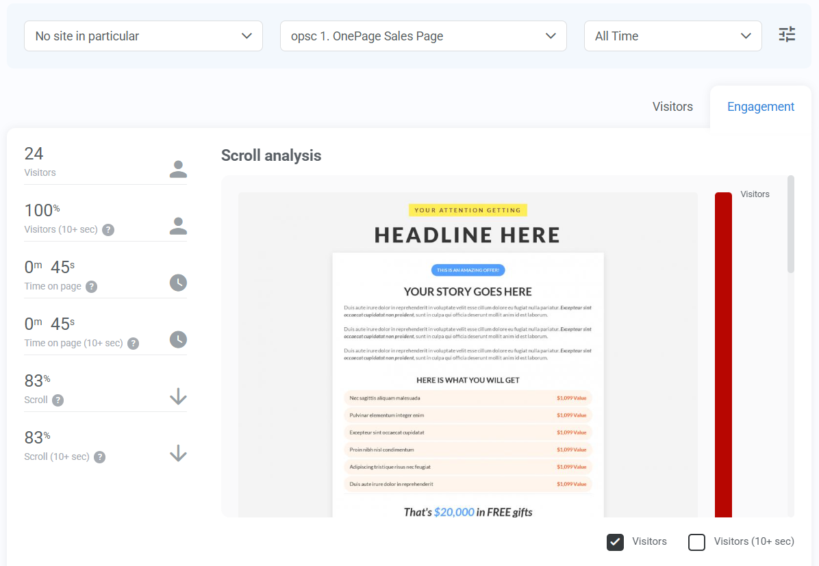 - Check the boxes below the chart to view data for all visitors or only those who spent more than 10 seconds on the page.